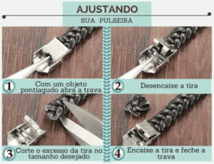 • Como ajustar:Abra o fecho da pulseira, depois com objeto pontiagudo destrave a presilha.  Em seguida, corte a pulseira com uma tesoura até o tamanho ideal para seu pulso. Cuidado para não cortar demais, sugerimos que corte pedaços pequenos e teste até ajustar com conforto em seu pulso. Depois prenda novamente a presilha e está pronta para utilizar.